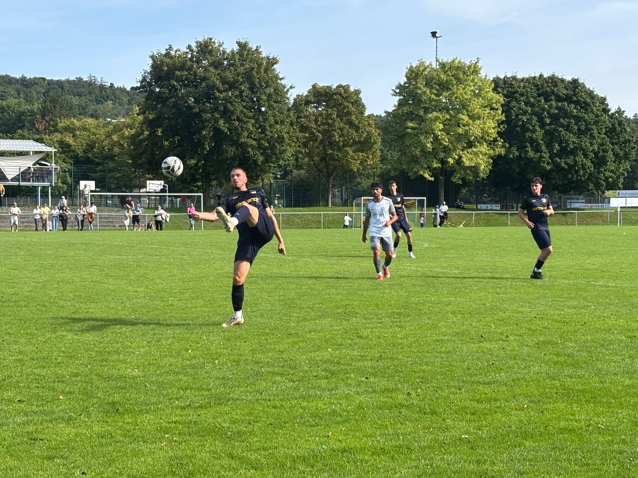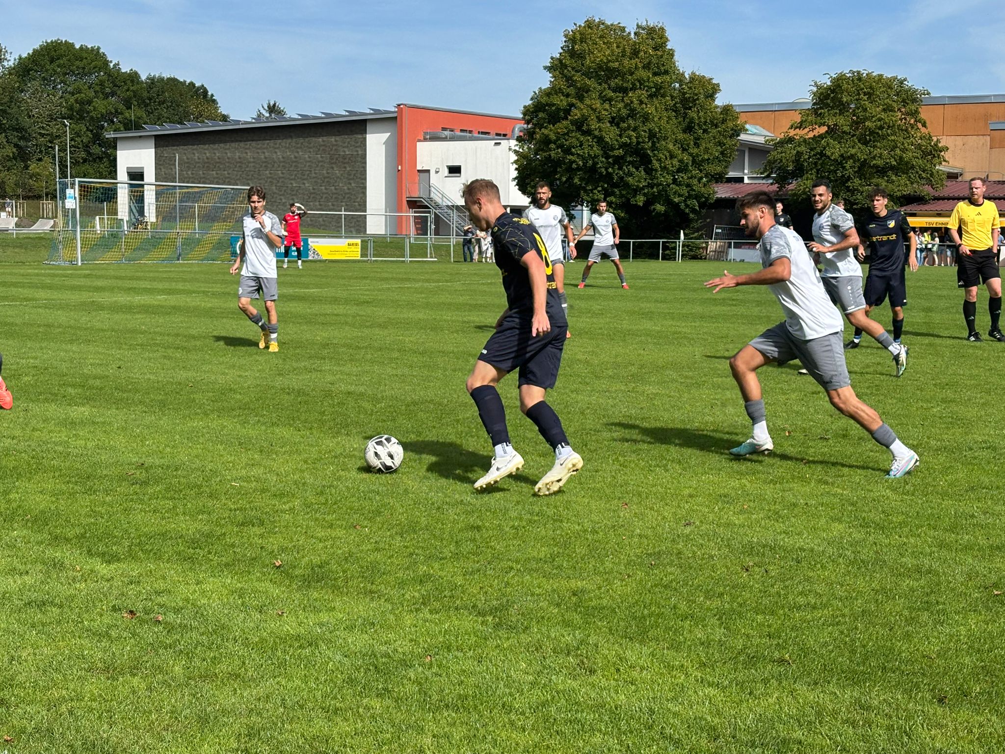 Für diese Partie warf Trainer Johannes Pfeiffer das Motto „never change a winning Team“ über den Haufen. Seine letzte Woche mit 5:0 in Echterdingen siegreiche Elf veränderte er auf vier Positionen und richtete die Mannschaft nominell etwas defensiver aus. Der Gast übernahm recht schnell die Initiative und kam nach 8 Minuten zu ersten Riesenchancen. Julian Milijus scheiterte zunächst an einem sagenhaften Reflex von Torhüter Mustafa Görkem und auch sein Nachschuss ging nicht ins Tor, sondern an die Latte.Durchatmen war angesagt. Nach etwa einer Viertelstunde befreite sich der TSV Ehningen etwas und kam selbst zu ersten Möglichkeiten. Nach 24 Minuten war eine Gleichheit der 100-prozentigen Chancen hergestellt, als eine Hereingabe von Lars Jäger am langen Pfosten Marcel Sigloch fand, der den Ball aus 3 Metern nicht über die Linie drücken konnte. Auch nach 37 Minuten scheiterte Marcel Sigloch, diesmal mit einem Kracher aus der Distanz gegen die Querlatte. Es blieb bis zur Halbzeit ein Spiel Spitz auf Knopf und beide Teams zeigten, warum sie bisher in der Landesliga performt hatten.